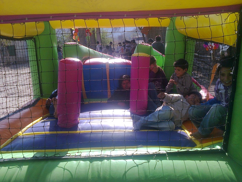 Los pequeños jugaron especialmente en un castillo inflable, que disfrutaron durante la tarde. Los mayores agradecieron la organización de la jornada, y comentaron que nunca antes les habían llevado un inflable, por lo que los rostros de los niños no sólo eran de sorpresa al principio sino también de felicidad. Durante toda la tarde, niños y padres disfrutaron del evento, compartiendo un almuerzo, juegos, bailes, juguetes y la merienda.