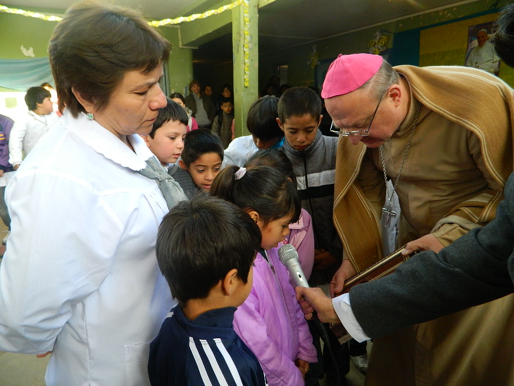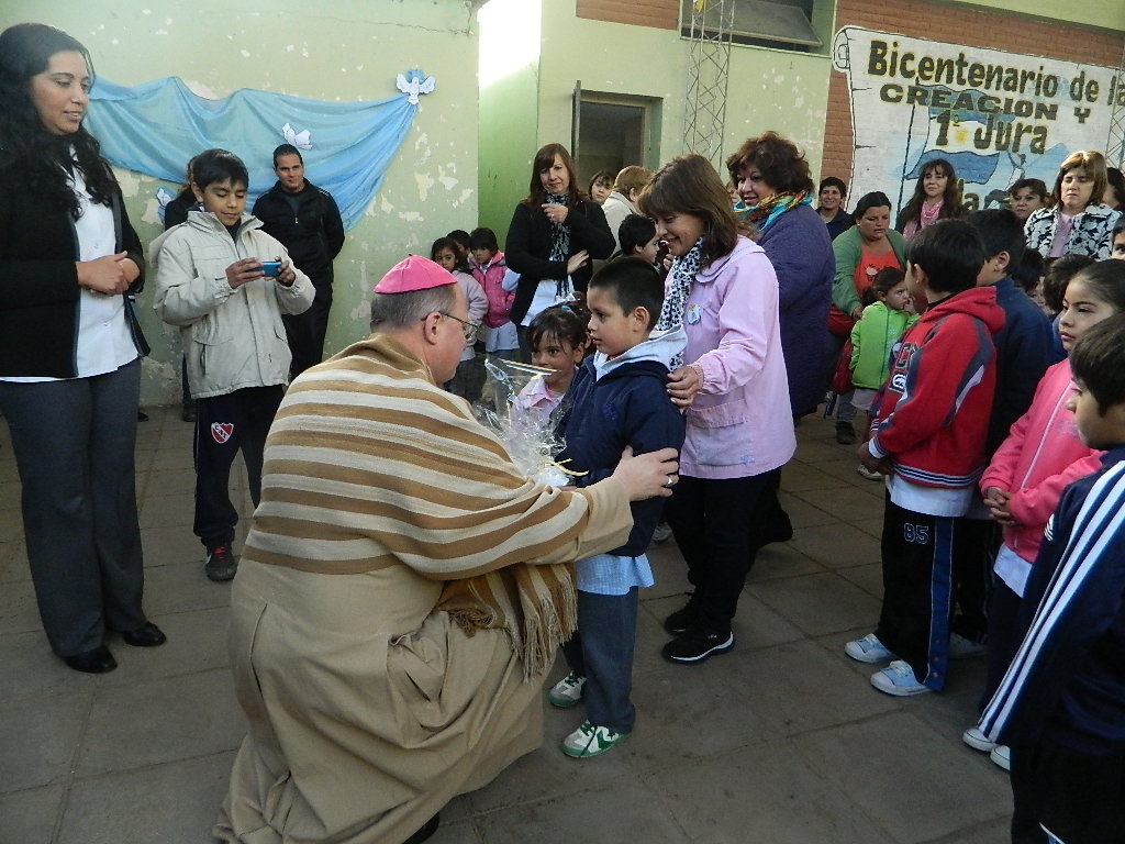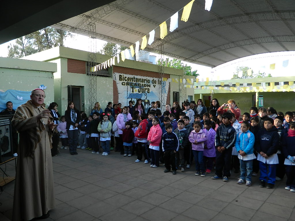 En el ingreso al edificio escolar, engalanado para la ocasión, fue recibido por la directora María Ovejero de Salcedo, quien lo acompañó hasta el patio, donde lo esperaba la formación de estudiantes, listos para participar del izamiento de la Bandera. Cumplida esta ceremonia, y tras el rezo del Padrenuestro, la señora directora resaltó que “es la primera vez que recibimos la visita de un obispo en esta escuela, que comenzó su labor en 1956, con tres aulas. Desde ese tiempo creció notablemente”, agregando que “es una bendición para nuestra escuela contar con la presencia de nuestro pastor, acontecimiento trascendental que debemos llevar en la retina”.