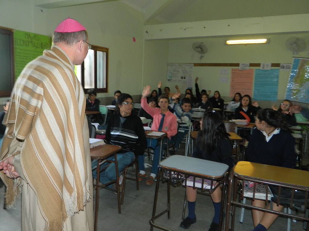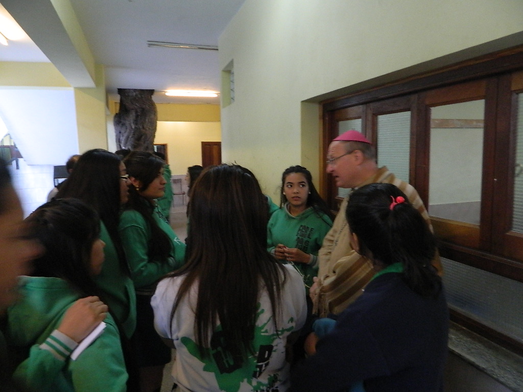 El acto de bienvenida contó con las palabras de la directora del Nivel Secundario, Prof. Daniela Díaz de Moraga, y la vicedirectora del Nivel Primario, Prof. Ana Solohaga, quienes resaltaron la alegría de tenerlo en su casa de estudios con expresiones como “el Pastor de nuestra Iglesia se acerca al rebaño”, agregando también que “lo esperamos para escuchar su palabra, sus consejos, sus felicitaciones en nuestros aciertos y sus correcciones si nos hacen falta”. Con fe y devoción en este tiempo de Misión Diocesana que vive la Iglesia de Catamarca, le pidieron “Fortalécenos en la fe para ser discípulos misioneros”.