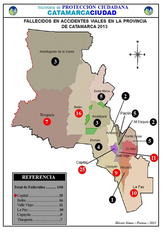Por otro lado, el secretario de Protección Ciudadana, Dr. Guillermo Matterson, manifestó que en el último mes del 2013 (diciembre), se produjeron un total de 216 accidentes viales en todo el ámbito de la provincia, según nuestros registros, 153 fueron protagonizados por motos y 63 por autos y otros, con un total de 14 víctimas fatales, (7 de motos, 3 en capital, 2 en rutas y 1 Valle Viejo) y (4 de autos y 3 de camionetas), 1 en capital (Vuelco de camioneta), 2 en Santa María – 1 Capayán – 2 en La Paz – 1 Ancasti), del número de accidentes, 138 fueron urbanos (112 de motos) y (26 de autos y otros) – 16 suburbanos (13 de motos y 3 de autos y otros), 42 fueron en rutas, 18 protagonizados por motos y 24 por autos y otros, 12 se registraron en calles del interior, 8 por motos y 4 de autos y otros.