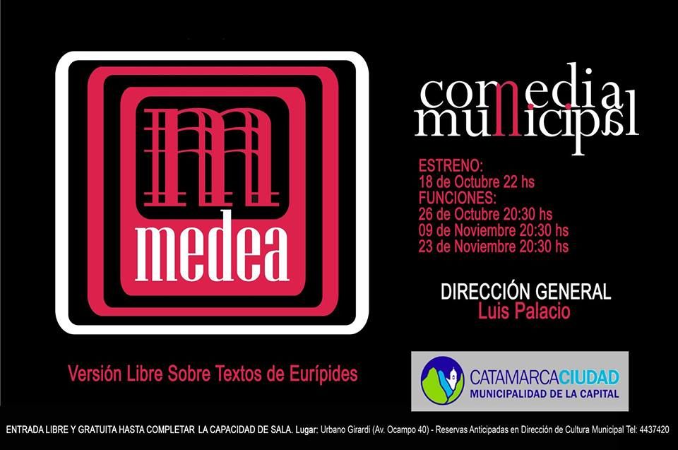 Bajo la dirección general de Luis Palacio, esta noche a las 22, la Comedia Municipal realizará el estreno de la obra "Medea. La tragedia de la Comedia Municipal”, en el Complejo Cultural Urbano Girardi, cito en avenida Ocampo N° 40 de esta Ciudad.