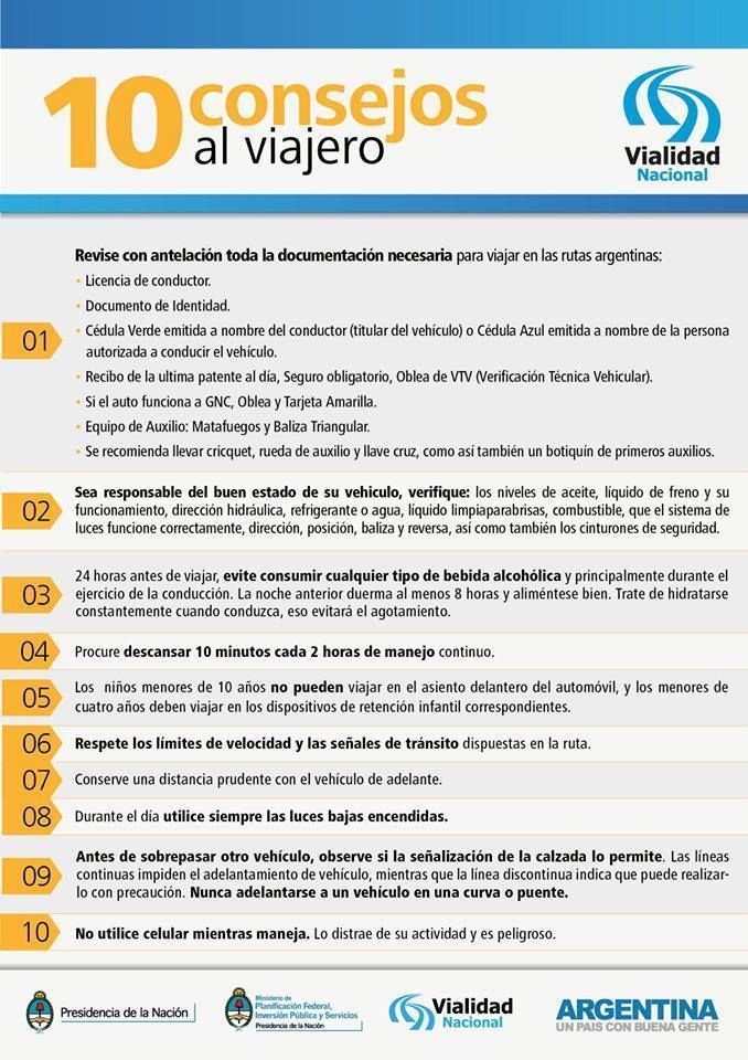 Importante:Atención a la presencia de animales sueltos en la ruta en varios sectores. Se recomienda a los usuarios respetar las velocidades máximas, especialmente en travesías urbanas, el uso de cinturón de seguridad y casco protector en el caso de motociclistas. Encender luces bajas obligatorias.