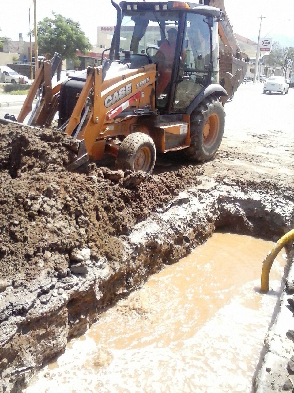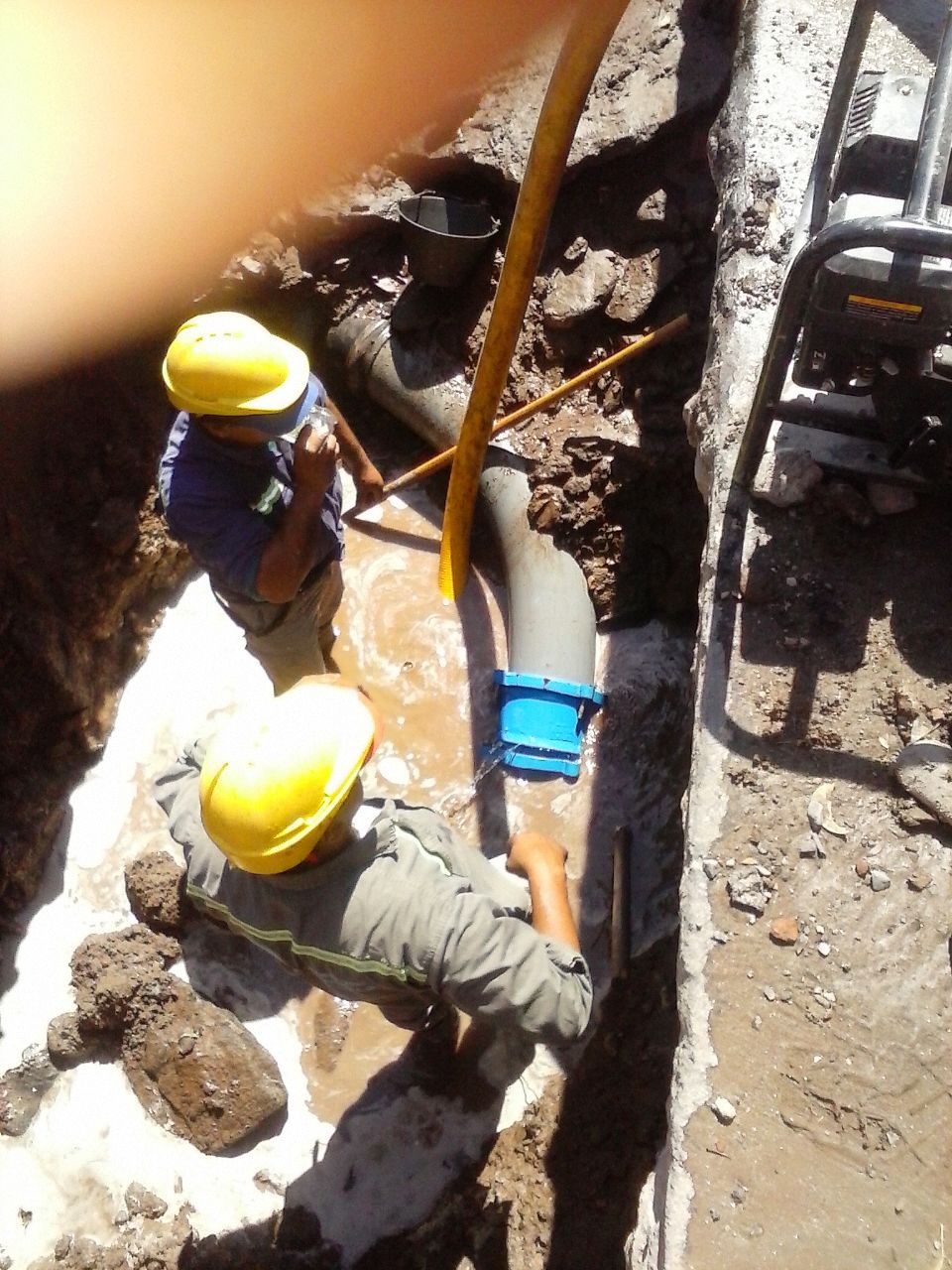 Personal técnico de redes de la empresa Aguas de Catamarca SAPEM, ejecuta desde el mediodia trabajos de reparacion de emergencia en cañeria de impulsión de agua potable de 200 mm, ubicada la esquina de avenidas Belgrano e Italia.