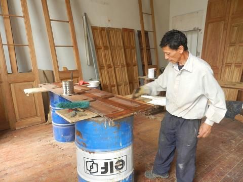 En la primera etapa de refacción y puesta en valor del histórico edificio, se ha removido cuidadosamente la maderería -puertas y ventanales- para someterla a un tratamiento de restauración con removedor y lijas a mano con el objetivo de prepararlas para ser barnizadas con un nuevo color natural.