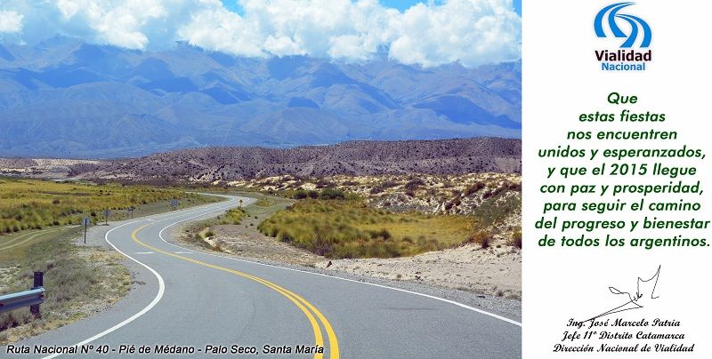 El Jefe del 11º Distrito Catamarca de la Dirección Nacional de Vialidad, Ing. Marcelo Patria, hizo llegar a los periodistas y propietarios de medios de prensa las salutaciones de Fin de Año, con los mejores deseos de paz y prosperidad para 2015.
