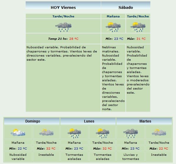 El Servicio Meteorológico Nacional prevé, en su pronóstico extendido, un fin de semana con temperaturas agradables cercanas a los 32°. Continuan altas las probabilidades de tormentas y chaparrones. Para el lunes se espera un brusco descenso de temperatura, ya que la máxima sería de tan solo 22°. Conozca cómo estará el clima.
