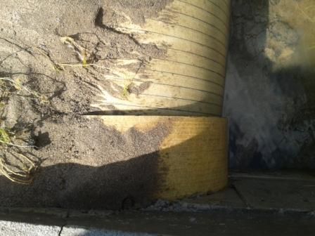 La tercera rotura, a la altura del kartódromo de Piedra Blanca hace unos meses atrás, se produjo por una falla en el caño, producto de las marcas (rasguños) que dejó la máquina retroexcavadora sobre el mismo. Comenzó como un pequeño orificio que fue desgastando la estructura del caño.