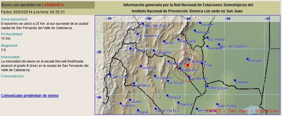 Según informó el INPRES, la intensidad del sismo en la escala Mercalli Modificada alcanzó el grado III (tres) en la ciudad de San Fernando del Valle de Catamarca.