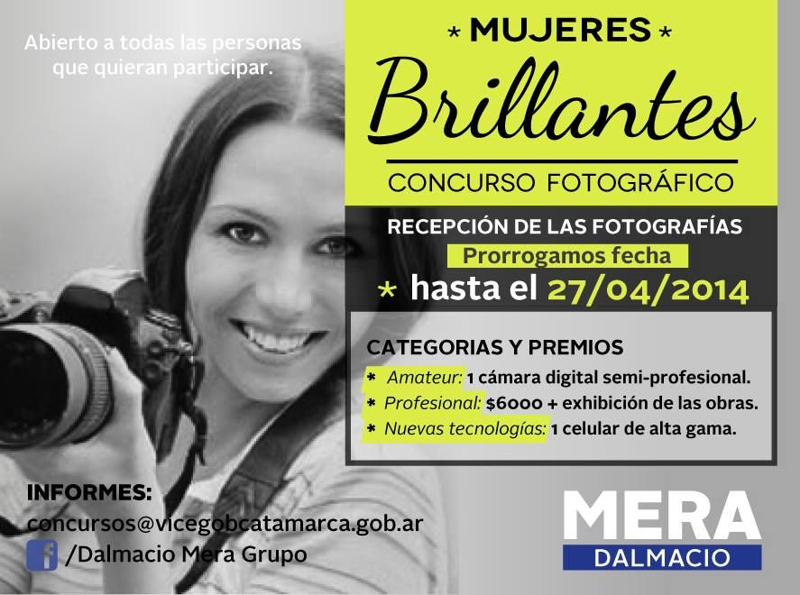 El concurso fotográfico "Mujeres brillantes”, comprende un doble aspecto: por un lado, un certamen abierto a todas las personas mayores de 16 años, residentes en Catamarca, que quieran participar con la temática de la mujer en Catamarca. Y por el otro, la convocatoria apunta a mujeres fotógrafas que podrán retratar temas libres.