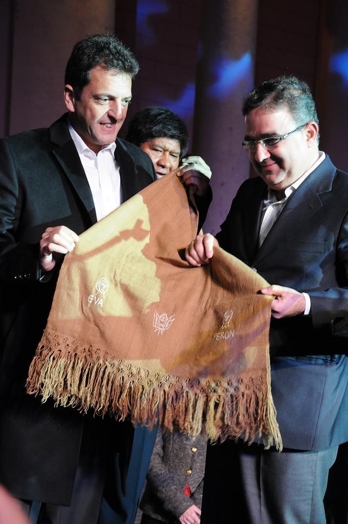 El intendente Jalil nombró al diputado Nacional Sergio Massa Huésped de Honor y le entregó una manta de lana de vicuña del artesano Gerónimo Yapura.