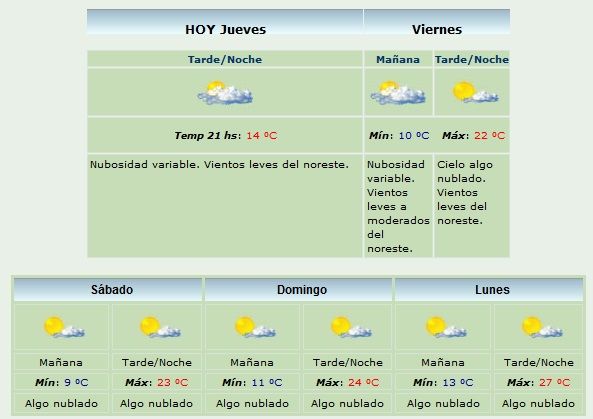 El pronóstico extendido del Servicio Meteorológico Nacional indica que el clima estará agradable fin de semana, con máximas cercanas a los 25°. Las mínimas, en tanto, se ubicarán en el orden de los 10°. El viento también dirá presente mañana, con ráfagas leves a moderadas.