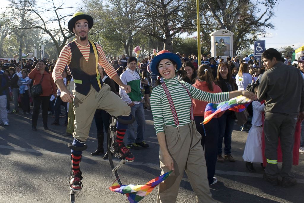 recorriendo la plaza en zancos, haciendo globología y animando a la gente a