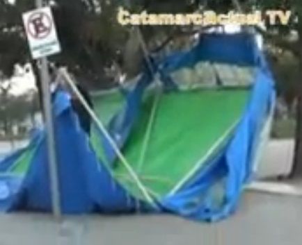 Una carpa de promoción de la Municipalidad de la Capital, que estaba instalada en la Plaza 25 de Mayo, frente al Paseo de la Fe, voló por los aires literalmente y se detuvo a varios metros de donde estaba emplazada.