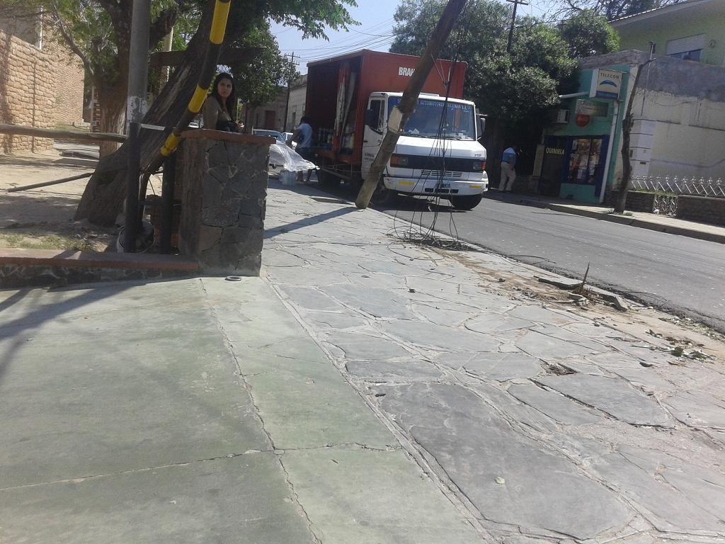 El poste está ubicado casi en el ingreso de la playa de estacionamiento del Ministerio de Salud, por calle Chacabuco. Si bien por el momento está amarrado, el fuerte viento contribuye a que pueda caerse en cualquier momento.