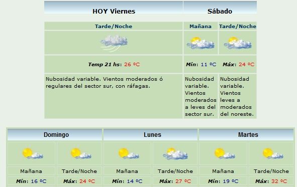 El pronóstico del Servicio Meteorológico Nacional indica buen clima para este sábado y domingo en el Valle Central catamarqueño. Se esperan máximas de 24° y mínimas de aproximadamente 12°. No están anunciadas precipitaciones. La temperatura irá subiendo paulatinamente con el correr de los días.