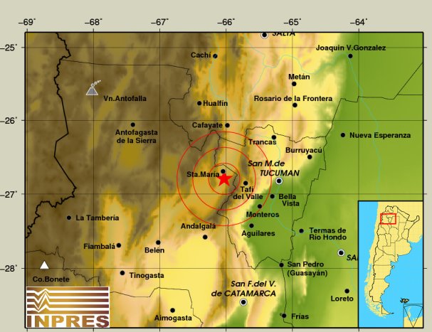 Epicentro: 83 km al O de San Miguel De Tucumán, 186 km al N de San F. Del Valle De Catamarca, 11 km al S de Sta.María.