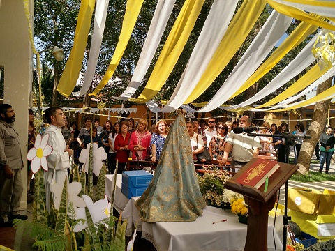 El recorrido de bienvenida finalizó en la Capilla de San Fernando, donde se celebró la Santa Misa presidida por el Pbro. Héctor Salas. La Virgen fue colocada junto al altar con todas las flores obsequiadas por cada dependencia. Gran cantidad de personas compartieron la celebración con emoción y en el momento de las ofrendas, se acercaron al altar los dones de pan y vino junto a las donaciones recolectadas, que serán destinadas a la atención de los peregrinos.
