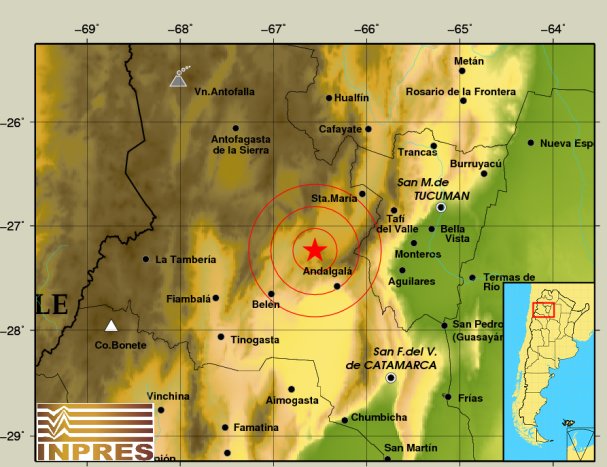 Epicentro: 142 km al O de San Miguel De Tucumán, 156 km al NO de San F. Del Valle De Catamarca, 45 km al NO de Andalgalá.