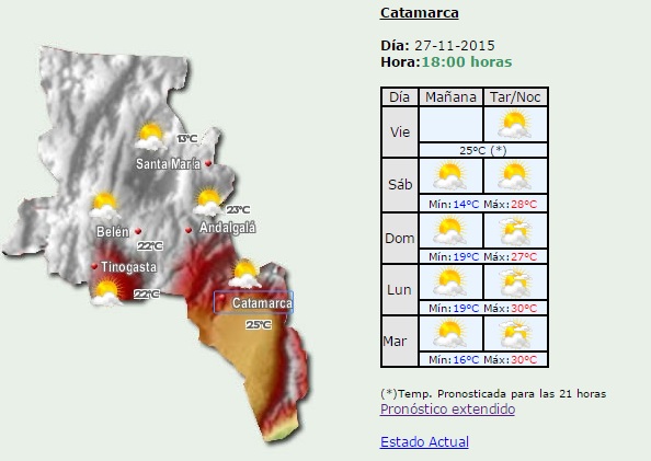 El Servicio Meteorológico Nacional prevé para los próximos días temperaturas agradables para el Valle Central catamarqueño con máximas que se ubicarán alrededor de los 30°. Las mínimas, en tanto, serán de 15°.