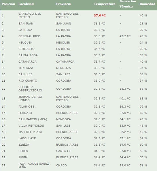 Jornada extremadamente calurosa en todo el País. Como casi siempre, Santiago del Estero lidera el ranking de temperaturas más altas. Así lo informa el Servicio Meteorológico Nacional (SMN).