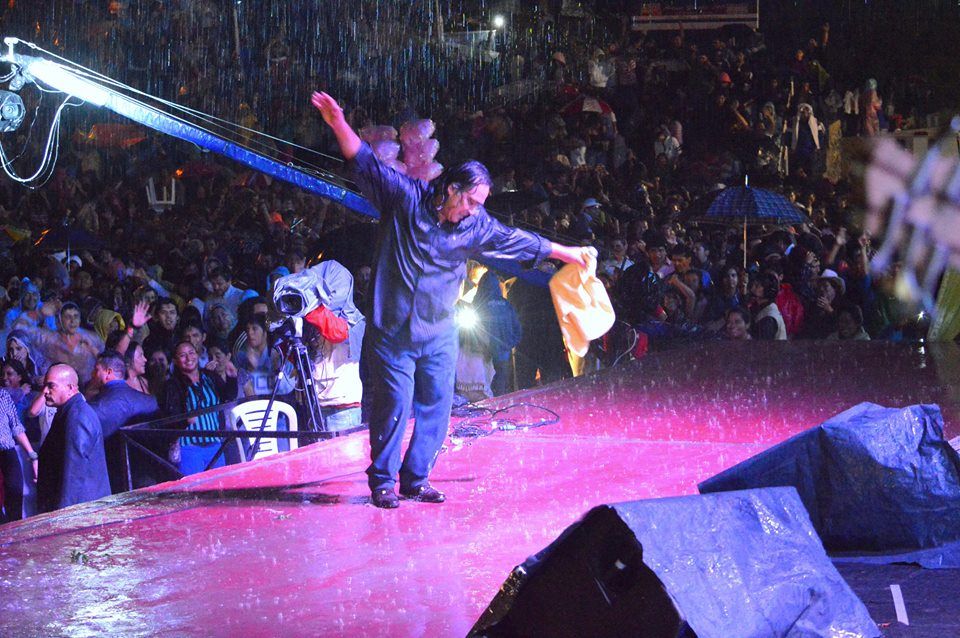 Fue de no creer, cuando Sergio Galleguillo hacia su ingreso al escenario una tenue lluvia comenzaba a acompañar al riojano, pero luego esta se intensificó y Galleguillo con muy buen manejo de público les dijo, "si ustedes se mojan yo también me mojo”, y es así que canto durante todo se recital fuera del techo del escenario, totalmente mojado pero poniéndole toda la chispa y el canto alegre de este grupo consagrado desde hace muchos años en Santa María.