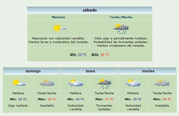 24º y una máxima de 36º, por la mañana algo nublado, y por la tarde noche,