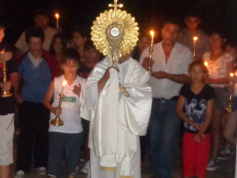 una procesión de antorchas con el Santísimo Sacramento alrededor de la plaza.