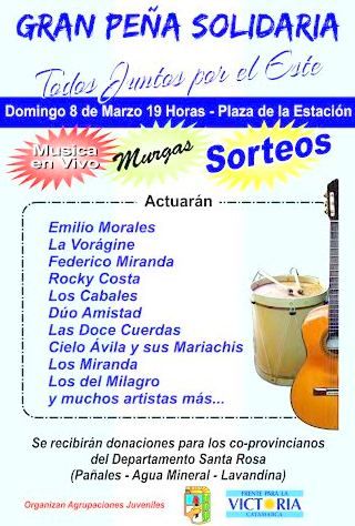 Este domingo, esta actividad solidaria se trasladará a la Plaza 25 de Agosto, donde –desde las 19 hs.- tendrá lugar la "Gran Peña Solidaria Todos Juntos por el Este”, con la presencia de diferentes números artísticos y murgas que ofrecerán música y shows en vivo. Además habrá sorteos de diferentes elementos para gratificar a los presentes.
