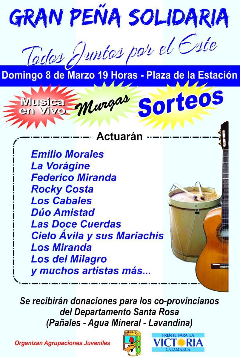 Este domingo, esa actividad solidaria se trasladará a la Plaza 25 de Agosto, donde –desde las 19 hs.- tendrá lugar la "Gran Peña Solidaria Todos Juntos por el Este”, con la presencia de diferentes números artísticos y murgas que ofrecerán música y shows en vivo. Además habrá sorteos de diferentes elementos para gratificar a los presentes.