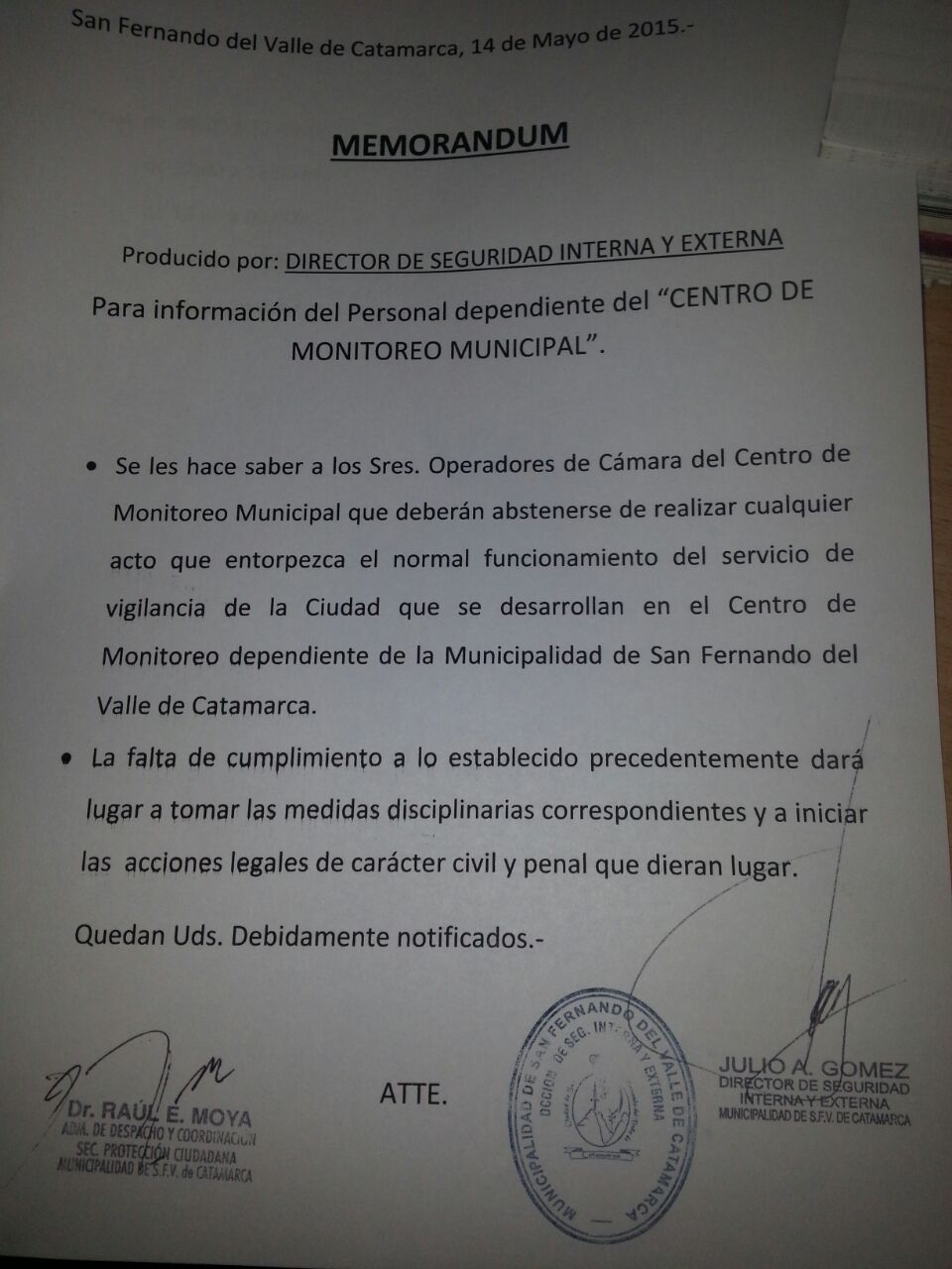"Las medidas que quieran tomar la pueden hacer de la puerta para afuera, los monitores no se pueden apagar, la vigilancia debe seguir”, manifestó echando del lugar al móvil de Radio Valle Viejo que se encontraba en el lugar.