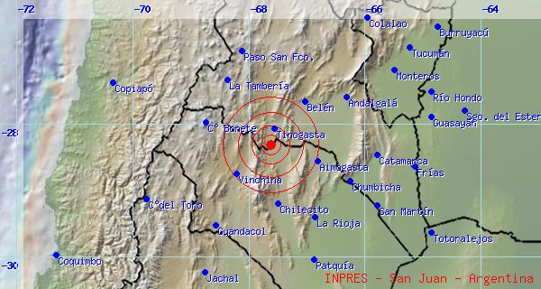 lunes, 4 de mayo de 2015 14:24 lunes, 4 de mayo de 2015 14:24 hora: 03:13:05 Zona epicentral 27 km al S de Tinogasta, 75 km al NE de Vinchina, 85 km al O de Aimogasta. . Profundidad: 139 Km. Magnitud: 3.2 Intensidad: