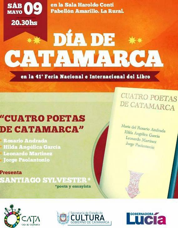 Organizado por la Secretaría de Cultura de la Provincia y la Casa de Catamarca en Buenos Aires, en la oportunidad se presentará una antología que ofrece un muestrario de la poesía de Rosario Andrada, Hilda Angélica García, Leonardo Martínez y Jorge Paolantonio, publicada por editorial El Imaginante. El escritor y ensayista Santiago Sylvester, de origen salteño y gran conocedor de la poética del NOA, tendrá a su cargo la presentación del libro.