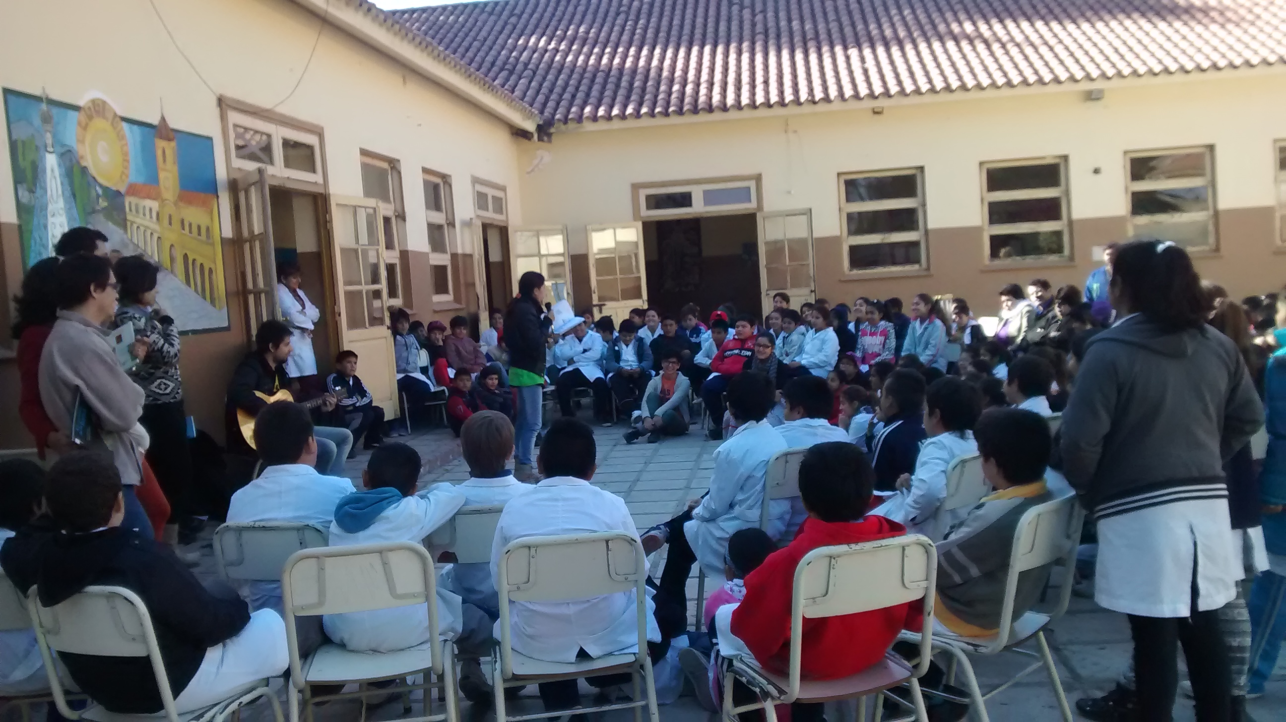 centenar de niños de la Escuela Nª 264 en la sede de la Biblioteca. Mientras