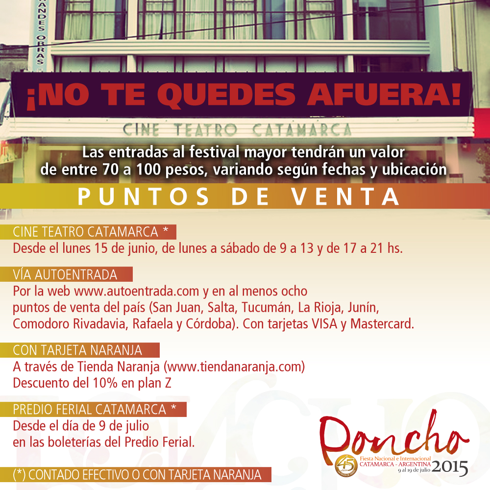 (www.tiendanaranja.com), en el Cine Teatro Catamarca o en el Predio Ferial, a