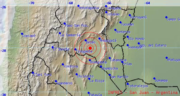 El movimiento sísmico de las 14 se ubicó a 40 km al Noroeste de Andalgalá, 59 km al Noreste de Belén, 108 km al Oeste de Monteros. Se registró a una Profundidad de 20 Km y 2.5 magnitud.