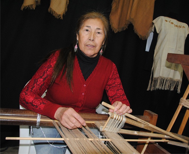 En su puesto la tejedora Guillermina Zárate, también monto su telar y por las tarde del domingo se dispuso a enseñar su talento su profesión a cuantas personas se lo pregunten.