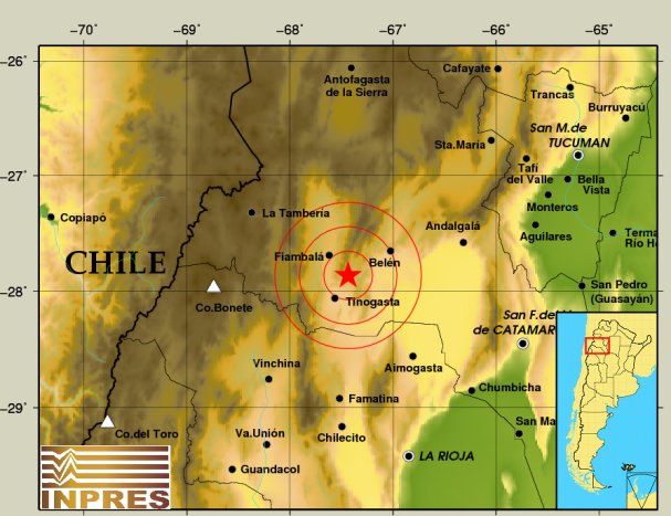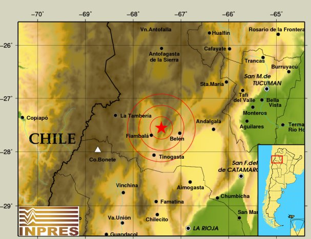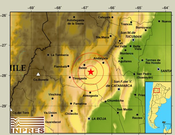 Epicentro: 25 km al NE de Fiambalá, 40 km al O de Belén, 58