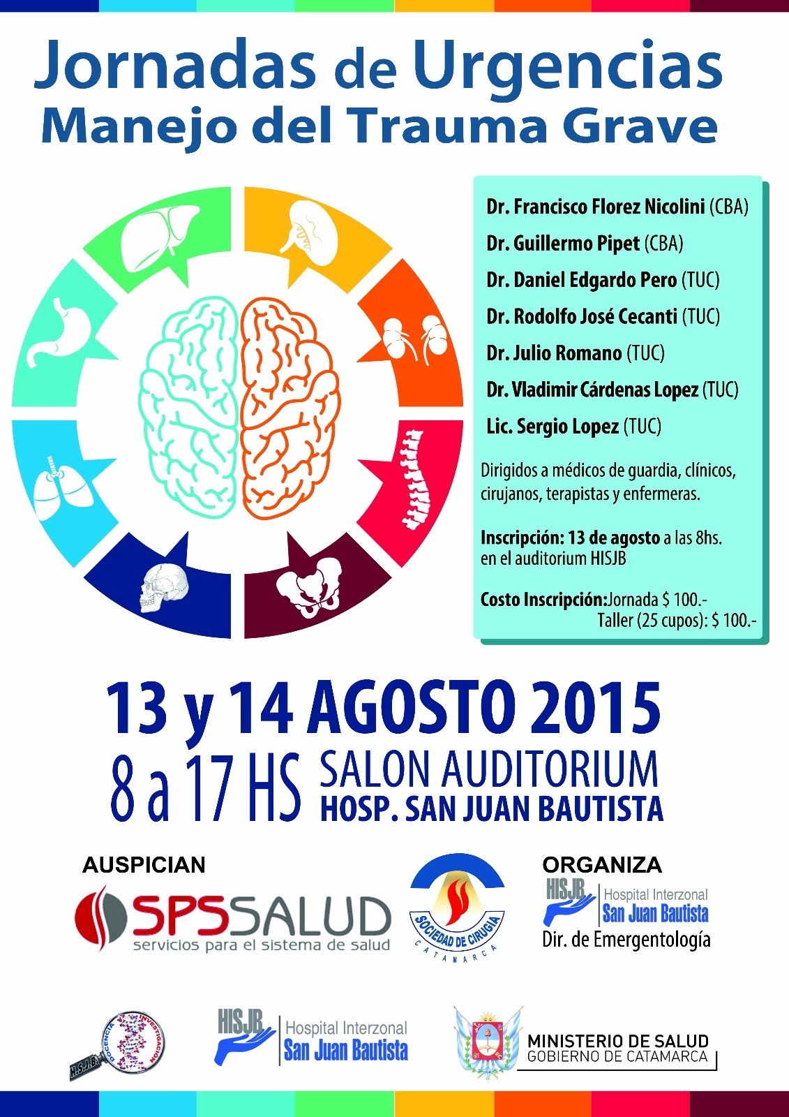 Los días 13 y 14 de agosto se llevará a cabo las “Jornadas de Urgencias – Manejo del Trauma Grave”, de 8 a 17 horas, en el Salón Auditorium del Hospital San Juan Bautista.