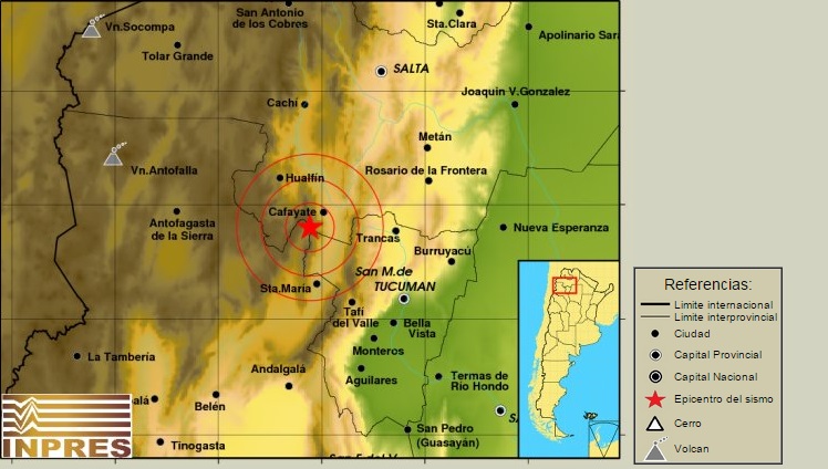| Epicentro: 114 km al NO de San Miguel De Tucumán, 168 km al SO de Salta, 21 km al SO de Cafayate. |