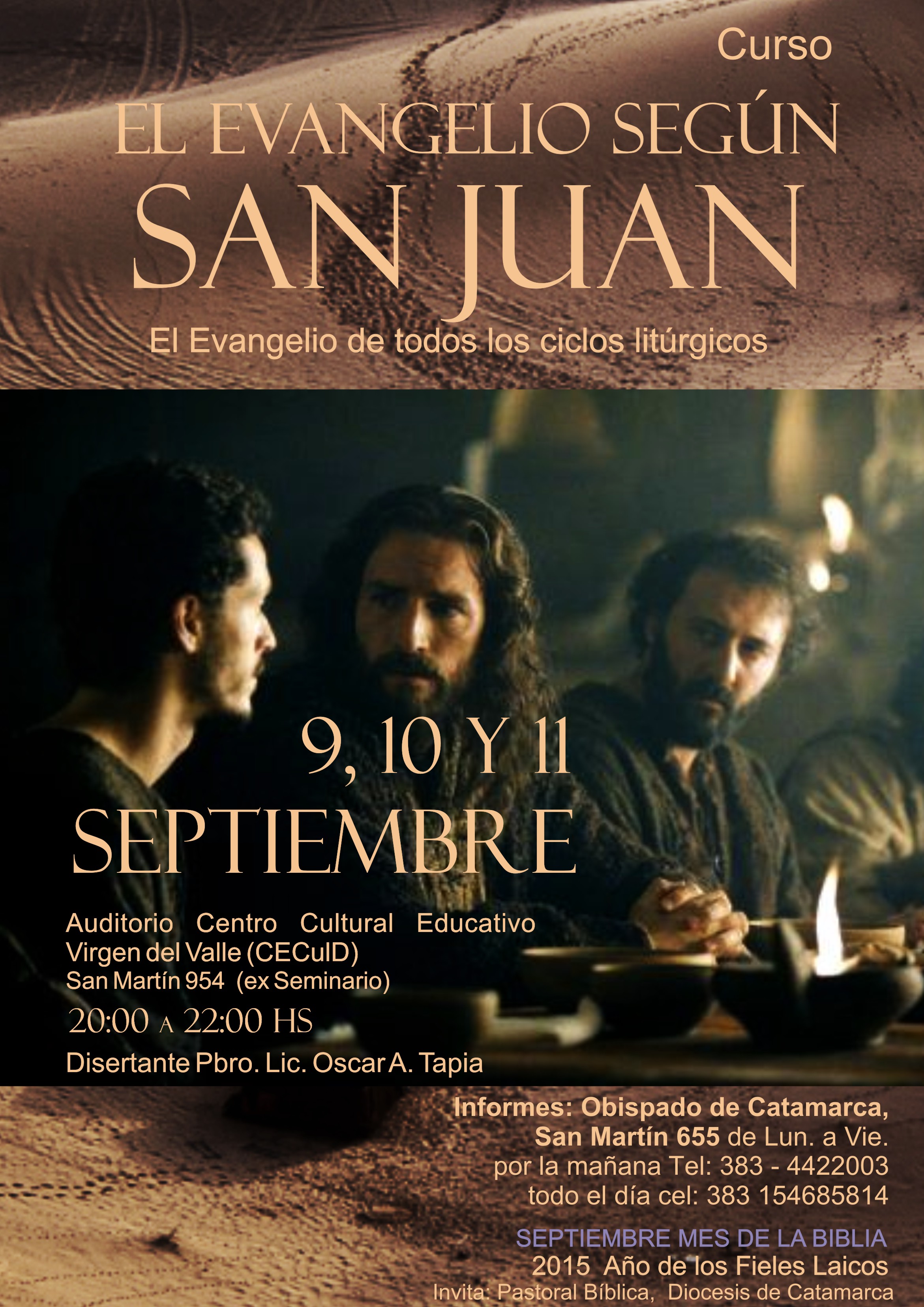 Asimismo, comunica que el miércoles 9, jueves 10 y viernes 11 de septiembre, se ofrecerá el curso sobre "El Evangelio según san Juan, El Evangelio de todos los ciclos litúrgicos”, que estará a cargo del Pbro. Lic. Oscar A. Tapia, en el Salón Auditorio Centro Educativo Cultural Diocesano Virgen del Valle, San Martín 954, de 20:00 a 22:00.