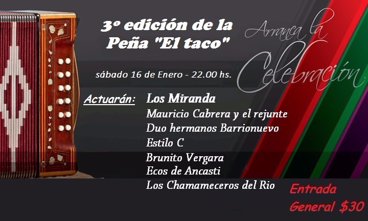 La peña contará con la participación de importantes números provinciales y destacados artistas locales como Mauricio Cabrera y el Rejunte, Los Miranda, Dúo Hermanos Barrionuevo, Estilo C, Brunito Bergara, Ecos de Ancasti, Los Chamameceros del Río y Dúo El Taco.