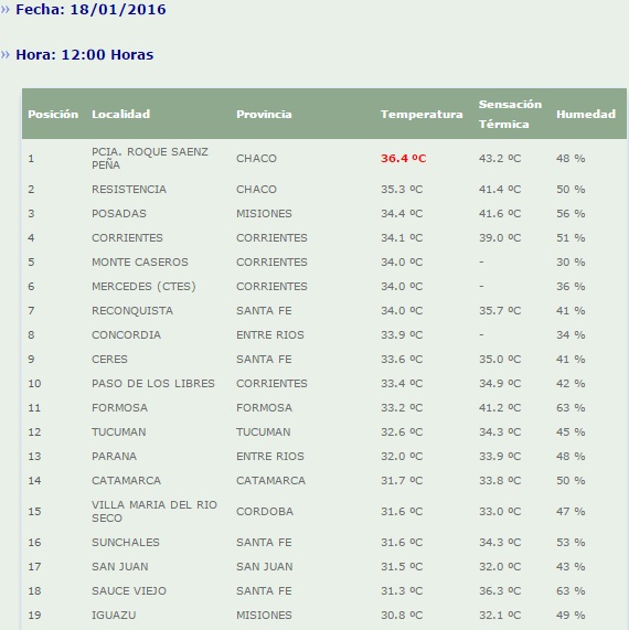 Según el ranking de altas temperaturas que elabora cada hora el Servicio Meteorológico Nacional, Catamarca se ubica en la posición 14°, con 31,7°. Las posiciones las lidera Roque Saenz Peña, en Chaco, con 36,4°. Conozca el lista actualizado al mediodía.
