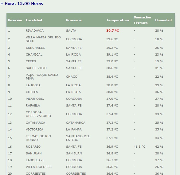A las tres de la tarde el ranking lo encabezaba la ciudad de Rivadavia, en la provincia de Salta, con 39,7°. La segunda ciudad más caliente es Villa María de Río Seco, en Córdoba. Conozca el ranking.