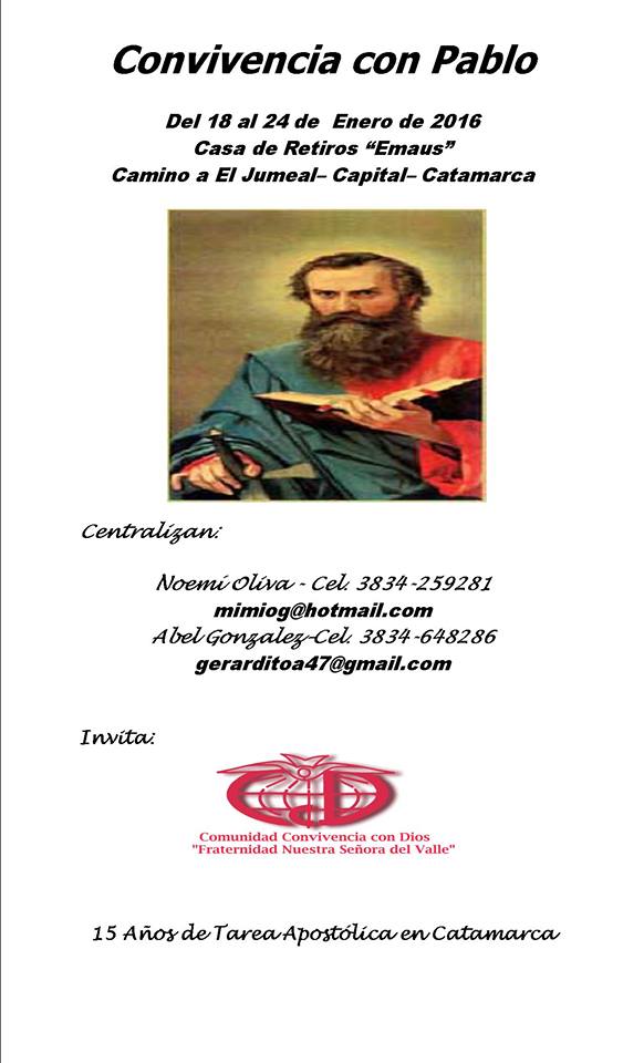 El Movimiento Convivencia con Dios invita al retiro espiritual denominado “Convivencia con Pablo”, que se realizará entre los días 18 y 24 de enero en la Casa de retiros espirituales Emaús, ubicada camino a El Jumeal.