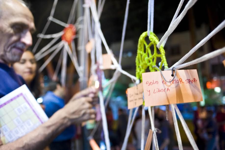 Y, tras el acto, ese lema se multiplicó en un montón de mensajes que la gente que disfrutaba de la noche del viernes en la plaza escribió en papeles y colgó sobre un entramado que rodeada la glorieta, generando una red de mensajes y de lecturas.