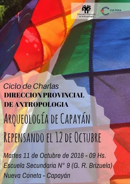 Continuando con el Ciclo de Charlas de la Dirección Provincial de Antropología, este martes 11 de octubre, a las 9 hs., se realizará en la Escuela Secundaria N° 9 “Guillermo Ramón Brizuela” de la localidad de Nueva Coneta, Departamento Capayán, la presentación "Arqueología de Capayán - Repensando el 12 de Octubre" a cargo profesionales de la Dirección Provincial de Antropología.