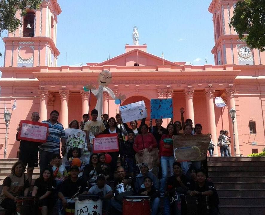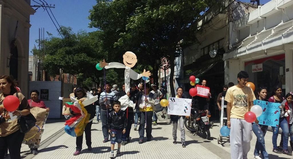 Familias completas, miembros de la Infancia y Adolescencia Misionera (IAM), junto con la murga Rompekabeza, partieron desde avenida Güemes portando carteles con frases como "Amigos de Jesús, misioneros de la vida", "Para mí la vida es Cristo", "La vida es misión", entre otras.