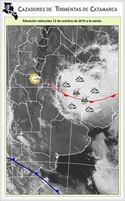 "Una masa de aire cálida y relativamente húmeda está comenzando a desplazarse hacia el sur formando un frente cálido (el que aparece con color rojo). A su paso, el mismo hace interacción con perturbaciones atmosféricas y como consecuencia se producen eventos de mal tiempo en la zona marcada con los íconos de tormentas y cielos nublados.