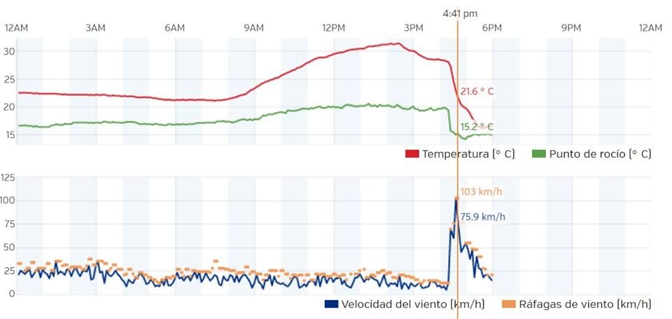 Nuestra estación meteorológica, ubicada en la zona oeste de la ciudad de San Fernando del Valle de Catamarca, midió ráfagas de 103 km/h, como pueden ver en el gráfico explicativo de la imagen", explicaron en su muro los Cazadores de Tormenta Catamarca.