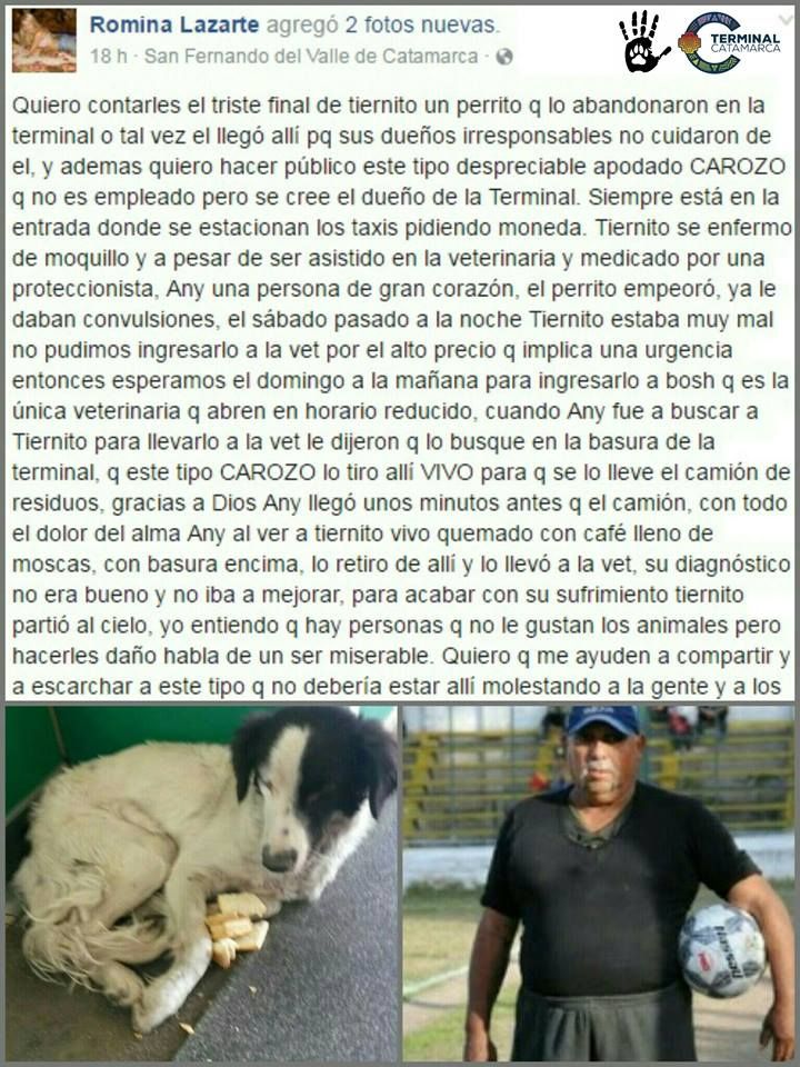 "Debido a la publicación de la Srita. Romina Lazarte en el día de ayer, que fue viralizada y compartida en las redes sociales la cual causó gran indignación y repudio total de la gente; el Administrador de #Terminal Catamarca, Alejandro Pérez Casasnovas, tomó la decisión de solicitarle al Sr. "Carozo” acusado de Maltrato Animal, que se retire de las instalaciones y dio instrucciones al personal de seguridad para impedir nuevamente su ingreso a cualquier área de la Terminal. El maltrato animal es algo que no puede volver a suceder, es por eso que asumimos la responsabilidad de remediar esta situación", señala un comunicado difundido a través de la cuenta de Facebook, de la Terminal de Omnibus.
